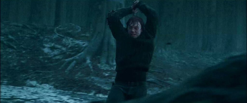 • De zoektocht naar het Medaillon: Harry, Ron en Hermelien ontdekken uiteindelijk dat het medaillon een Horcrux is en dat het vernietigd moet worden om Voldemort te verslaan. Ze gebruiken een zwaard van Gryffindor om het medaillon te vernietigen, wat leidt tot de vernietiging van het stukje van Voldemorts ziel.